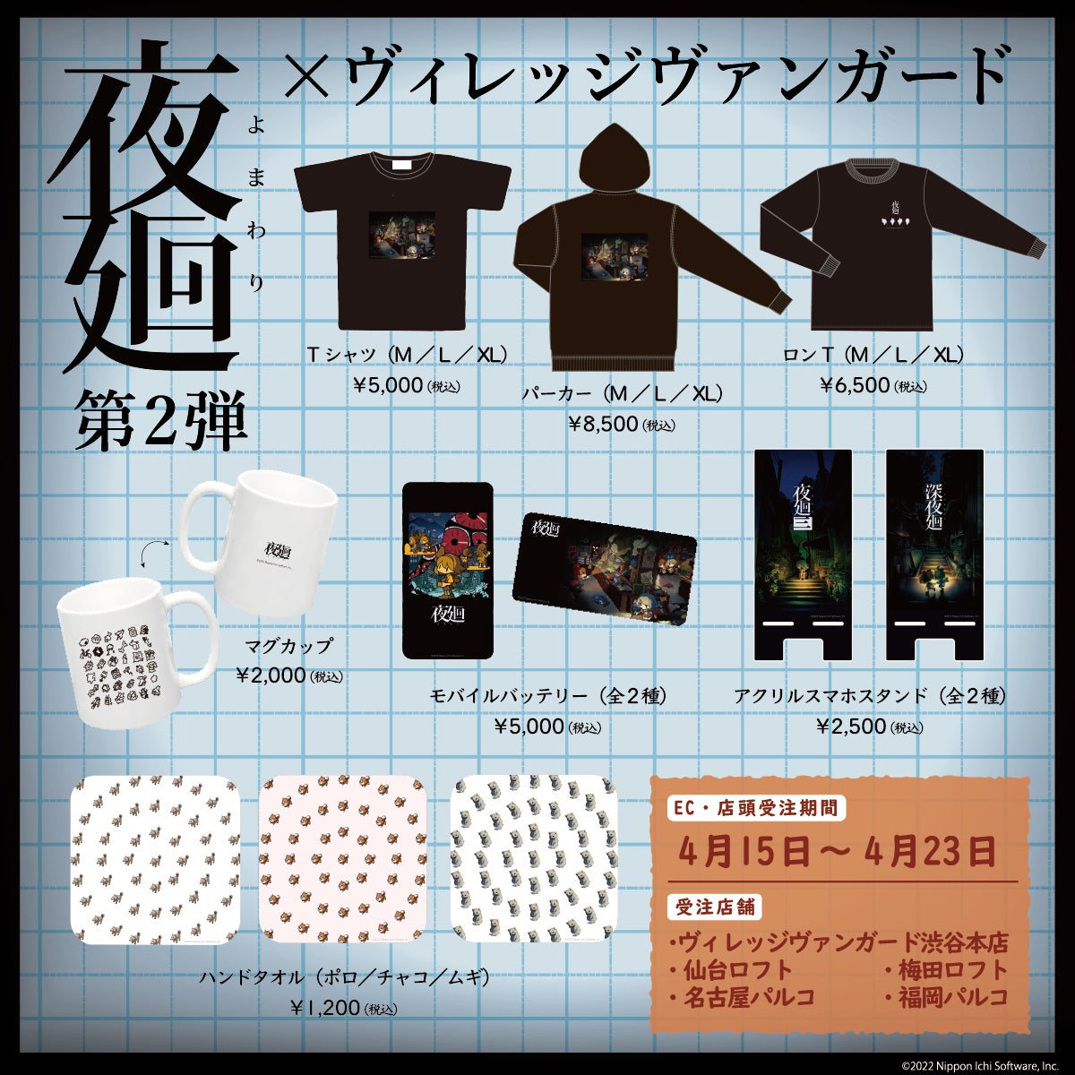 - 夜廻三、夜廻×ヴィレッジヴァンガード、Tシャツ、パーカー、ハンドタオル、モバイルバッテリー、アクリルスマホスタンド、マグカップ、キャラスタンド、絵馬、トートバッグ、ランダム缶バッジ、クリアポーチ、タンブラー、ダイカットクッション