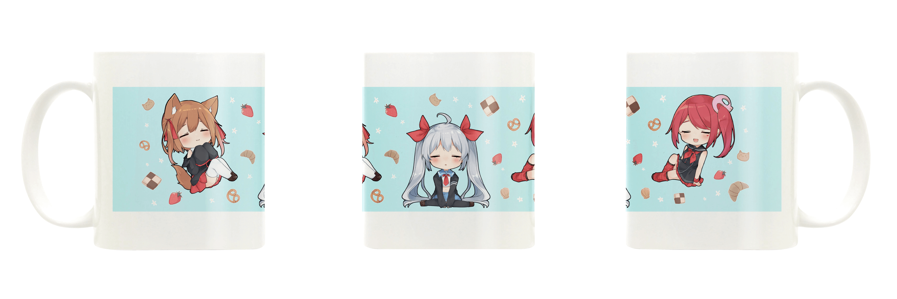 - Tシャツ、アクキー、キャラスタンド、缶バッジ、マグカップ、モババ、スマホケース、ロンT、抱き枕、ステッカーなど全10種類
