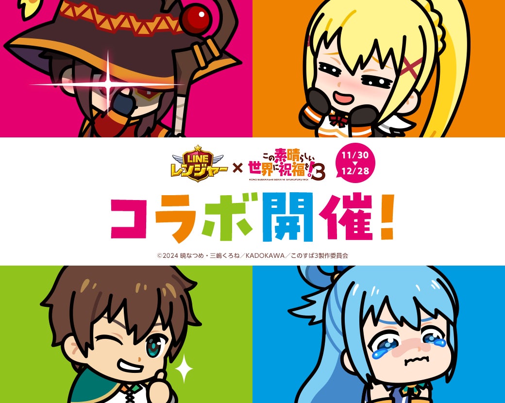 LINEヤフー株式会社は、防衛バトルゲーム「LINE レンジャー」とアニメ『この素晴らしい世界に祝福を!3』のコラボレーションを開始しました。
