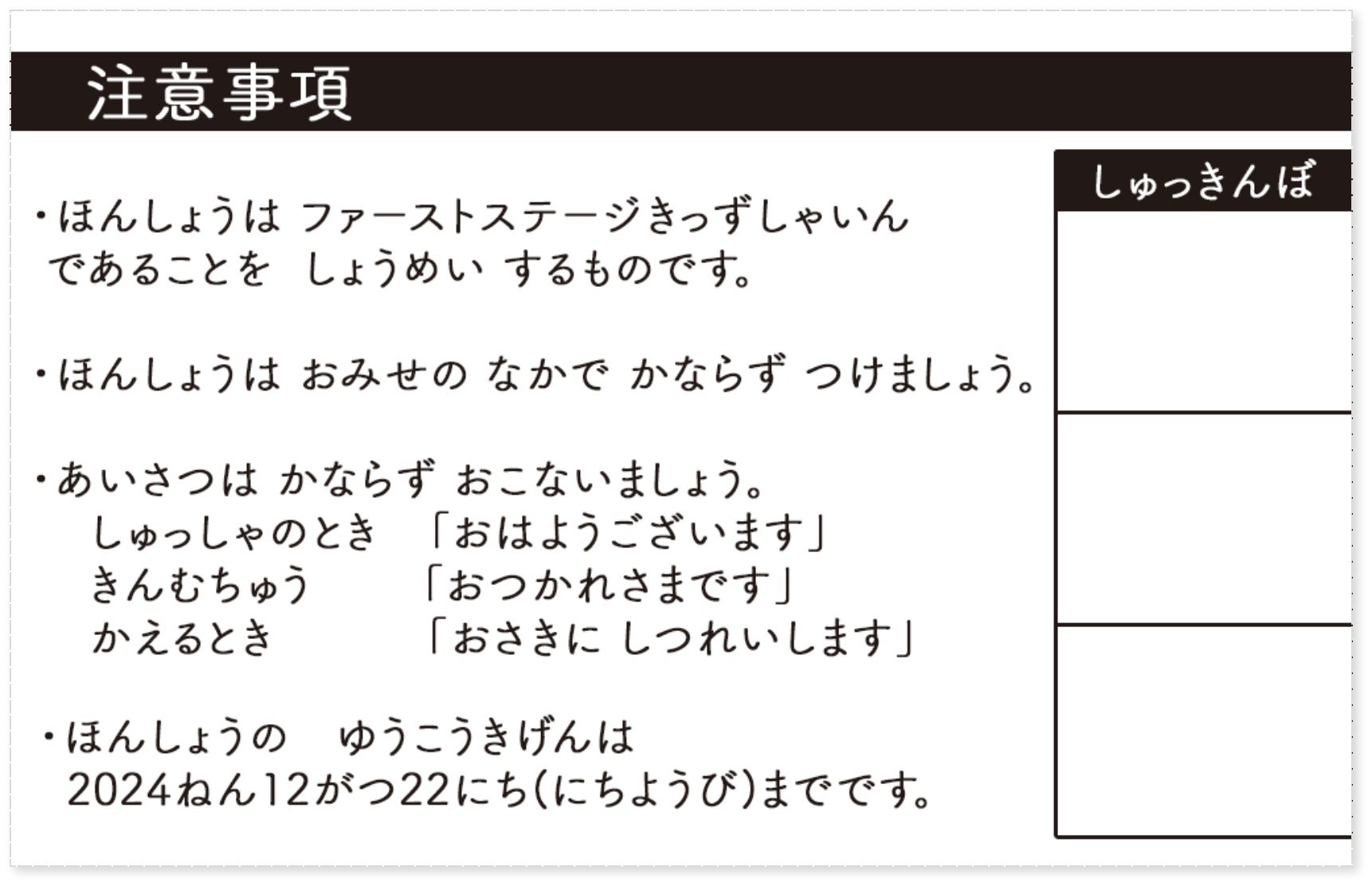 また、キッズ社員証を持って出勤すると、出勤簿にスタンプがたまり、景品がもらえます。