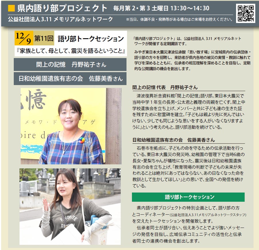 県内語り部プロジェクトは公益社団法人3.11メモリアルネットワークが開催する定期講話で、令和5年度は全20回で毎月第2・第3土曜日の13:30〜14:30に開催されます。