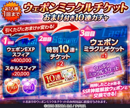 ウェポンミラクルチケットおまけ付きの10連ガチャやスキン交換も新登場!最新情報は公式サイトや公式Twitterでご確認ください。
