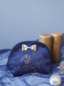 ネイビーの生地にゴールドの箔プリントを施し、バッグにはアーシャとスター、ポーチにはヴァレンティノとスターのプリントが施されています。