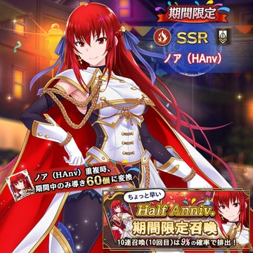 - 期間限定召喚では、新衣装SSRノア(HAnv)が登場し、10連召喚で排出確率が高まる