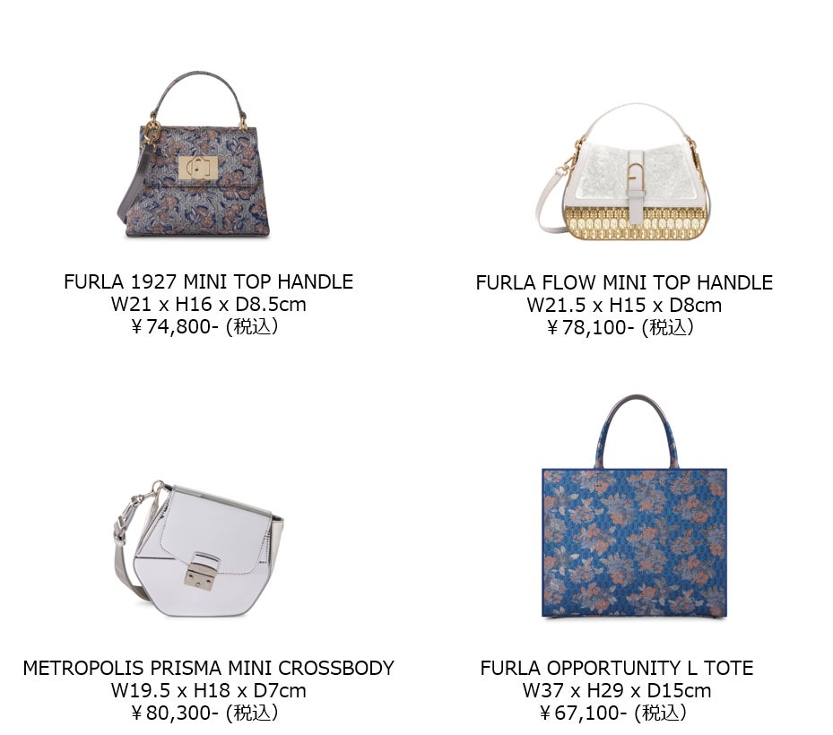 - ジャカード地を使用した「FURLA 1927 MINI TOP HANDLE」や「FURLA OPPORTUNITY L TOTE」などのバッグが登場