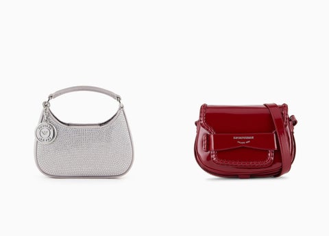 ラインストーンをあしらったサテン製のミニバッグやパテントレザーのフラップ付きショルダーバッグは、華やかな存在感でコーディネートを盛り上げます。