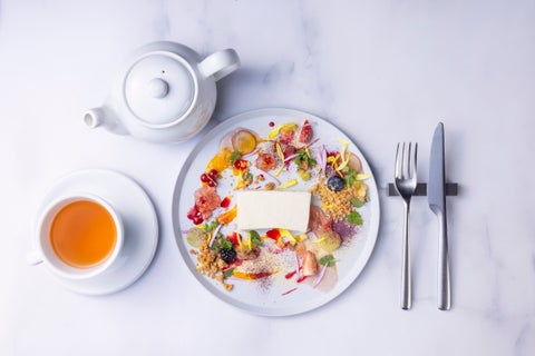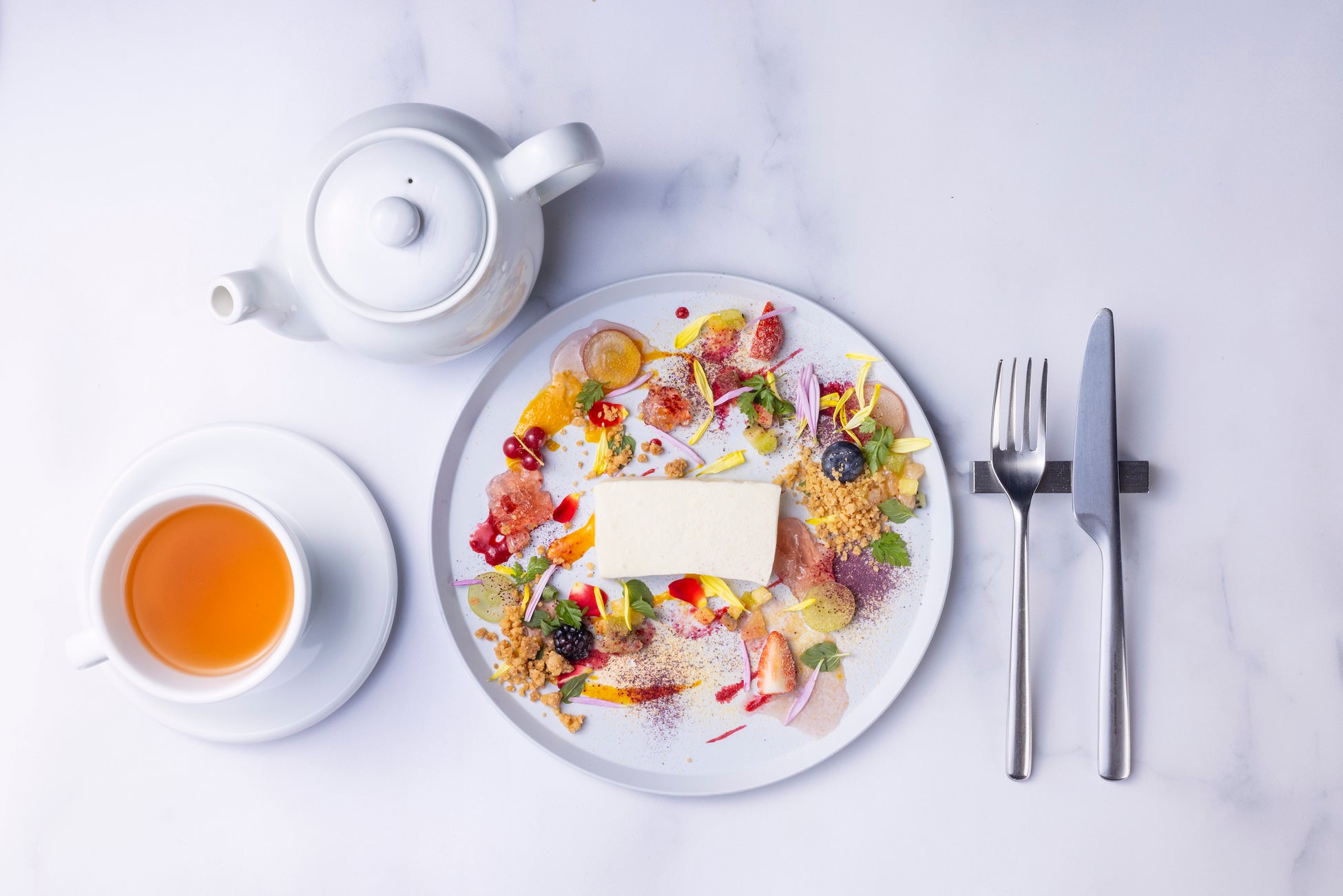 このデザートは、ホワイトチョコレートのムースとクリームチーズをベースに、群馬県産のカラフルなフルーツやフレッシュなソースを組み合わせ、多様な食感を楽しめる一皿です。