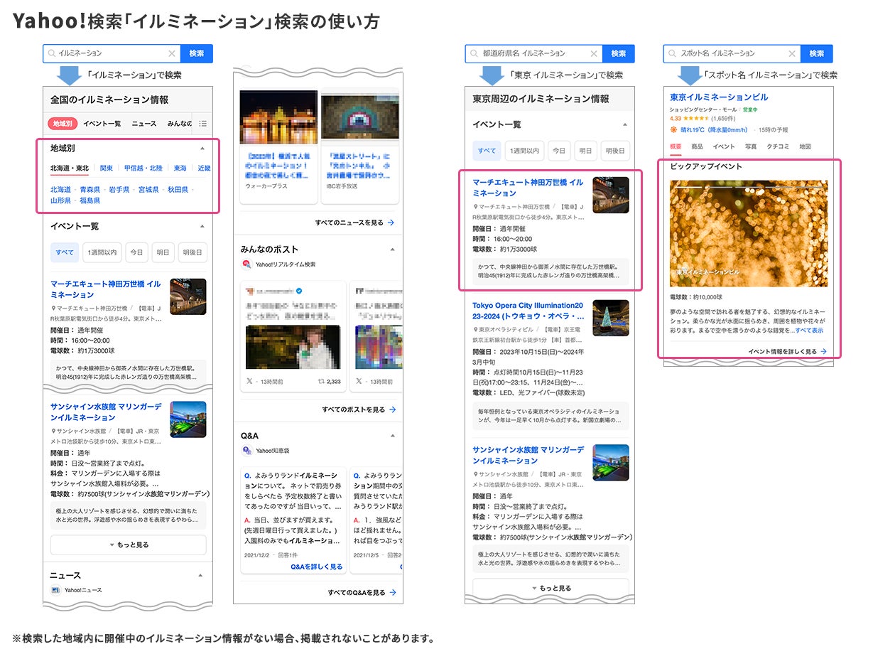 - Yahoo!検索ではイルミネーションに関連するキーワードで検索すると全国のスポット情報が表示
