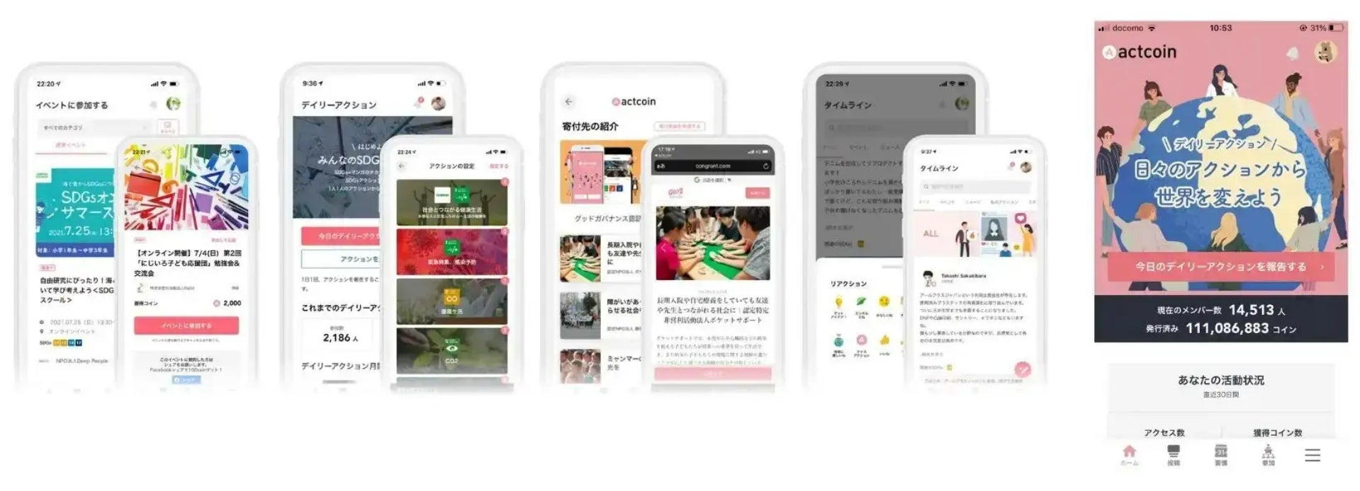 - actcoinという社会貢献アプリが個人の活動を報告し、SDGsの達成に寄与する活動を促進している。