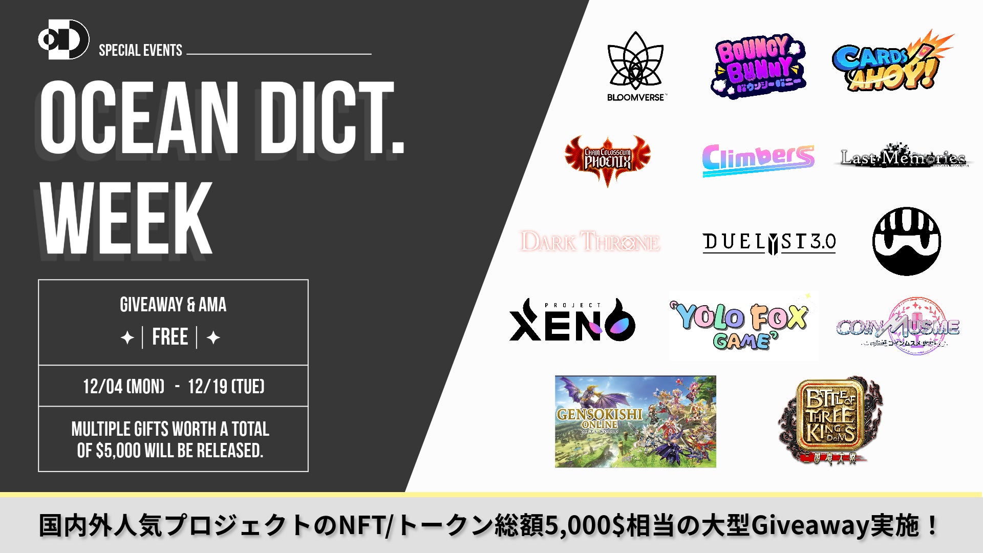 「Ocean Dict. Giveaway Week」は、ブロックチェーンゲーム市場の活性化を目指して開催されるイベントです。
