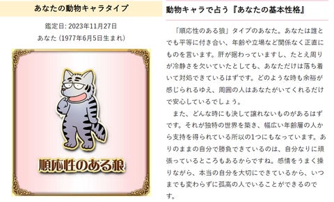 - 生年月日から60種類の動物キャラクターとタイプを診断