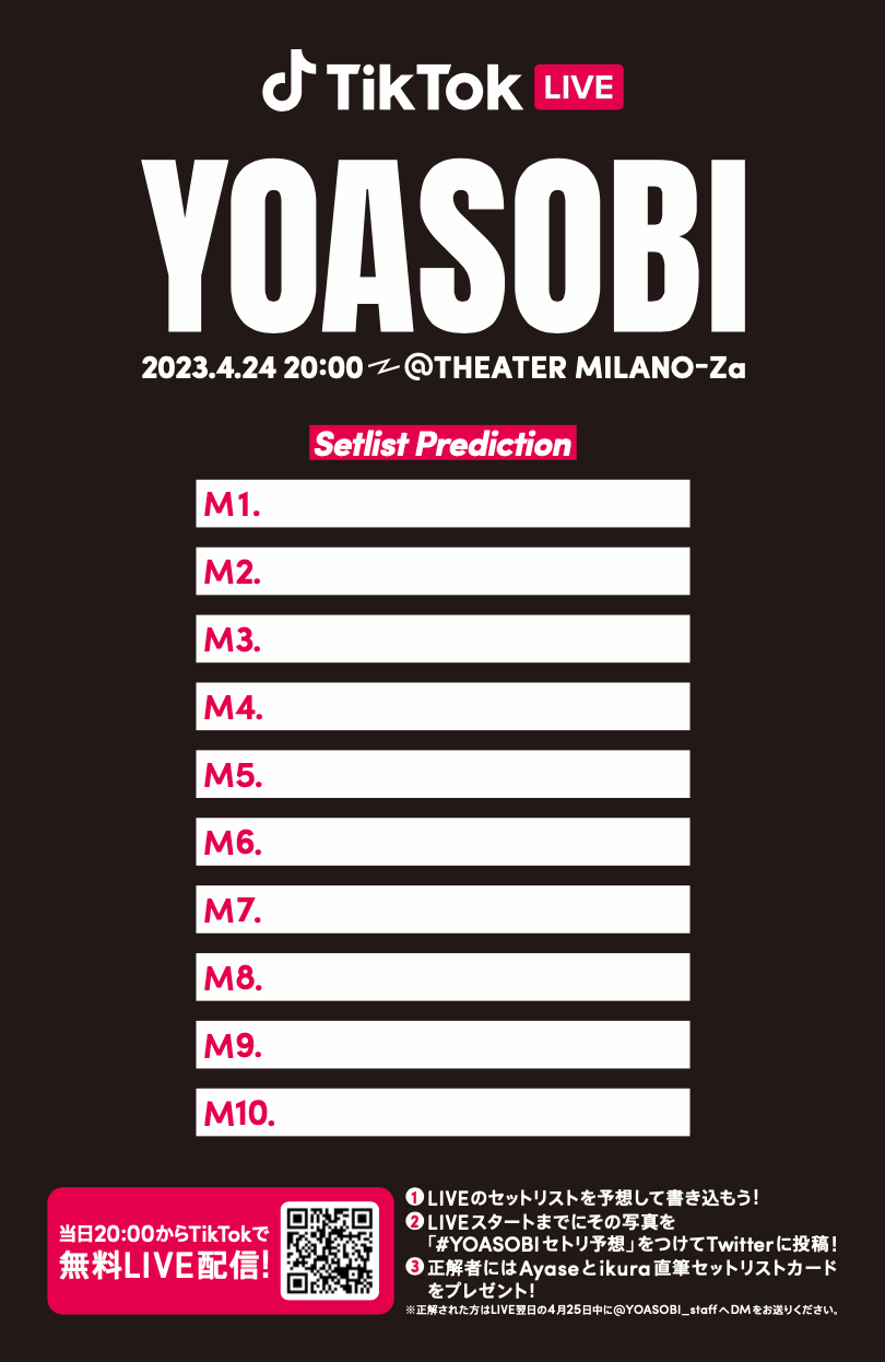 ③TikTok LIVEのセットリストを予想する「#YOASOBIセトリ予想」企画を本YOASOBI TikTok LIVEに合わせて開催します。各社コンビニのネットプリントでセットリスト予想カード出力いただき、予想を書き込んでいただいた写真をLIVEスタートまでに「#YOASOBIセトリ予想」をつけてTwitterに投稿いただくことで参加できます。正解者をYOASOBI公式TwitterからTikTok LIVE後に発表します。※予想が的中された方はLIVE翌日の4月25日中に@YOASOBI_staffへDMをお送りください。