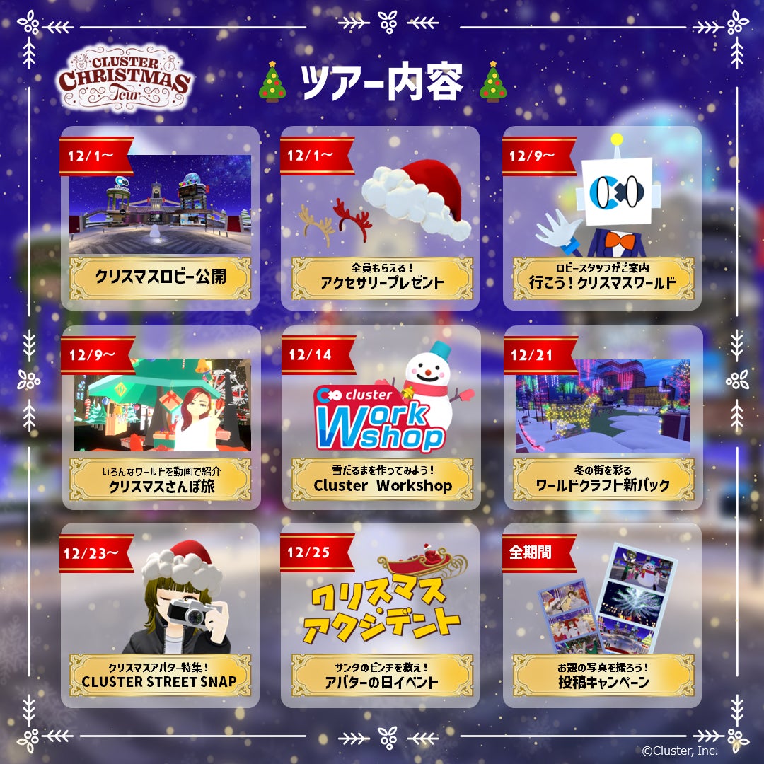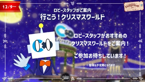 「クラスタークリスマスツアー」が開催されます!12月1日から、クリスマスバージョンのロビーが公開され、様々なイベントが行われます。