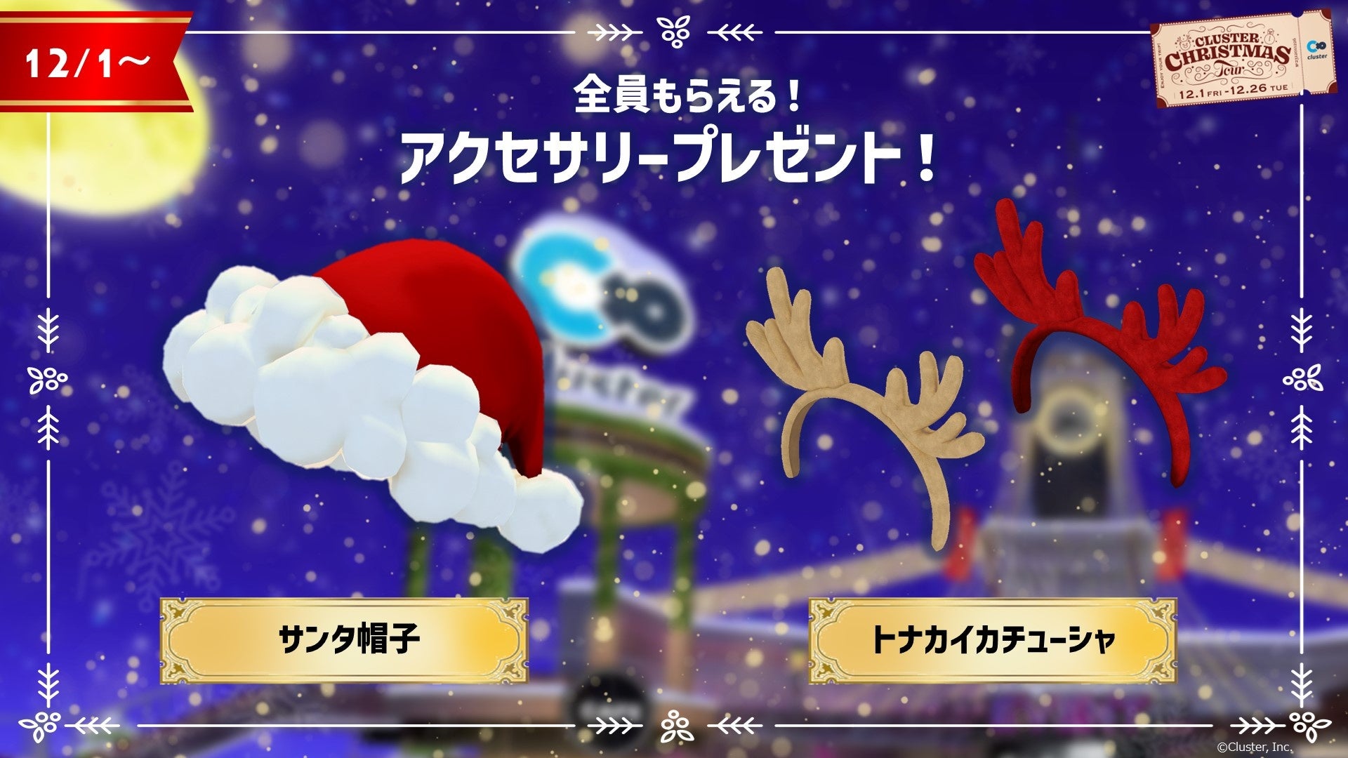 また、全員には「サンタ帽子」と「トナカイカチューシャ」がプレゼントされます。