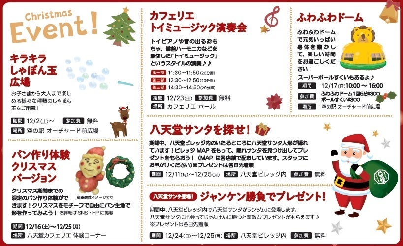 八天堂創業90周年アニバーサリーイヤーの今年は、「八天堂サンタからの贈り物」というテーマで、期間限定の可愛らしいお食事・スイーツメニューの提供や参加体験型のイベントを開催します。