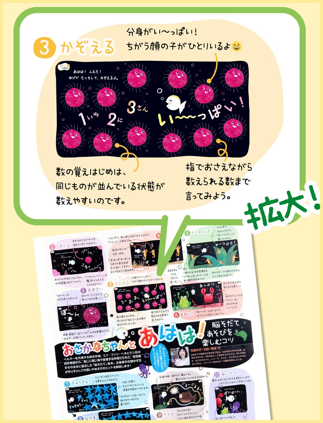 - 脳を育てる工夫が詰まった絵本で、数える遊びや絵さがしも楽しめる