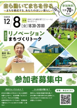 浜松で開催されるトークイベントには、まちなか再生のキーマンであり、全国的に活躍するリノベーションまちづくりの第一人者である西村浩さんが特別ゲストとしてお招きされます。