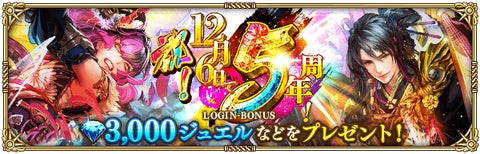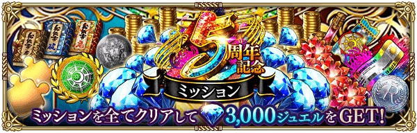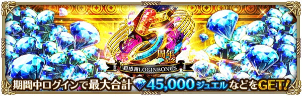 5周年記念超感謝ログインボーナスが開催されます!最大30日間ログインすると、45,000ジュエルと自動再戦チケット15,000枚がプレゼントされます。