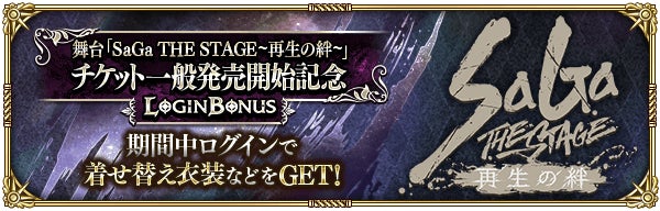 また、ロマンシングサガ2の30周年記念ログインボーナスや舞台「SaGa THE STAGE~再生の絆~」チケット一般発売開始記念ログインボーナスもあります。