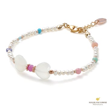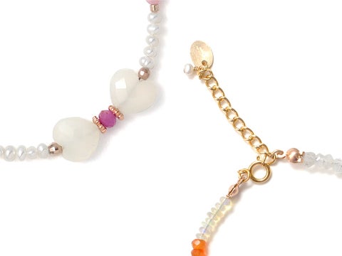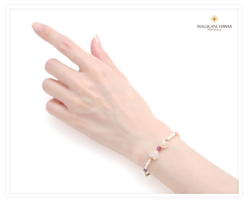 - 「Moon Ribbon Rainbow」は、月のムーンストーンや海の淡水パールにレインボーカラーのストーンを組み合わせたブレスレット