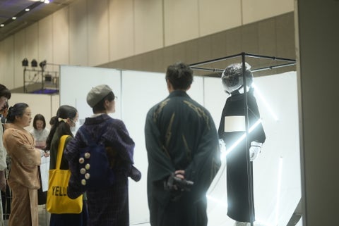 「きものサローネ2023」で展示された史上最も黒い着物は、特級暗黒布「太黒門」を使用して手縫いされた作品です。