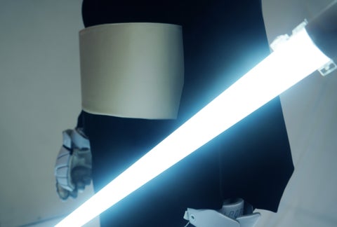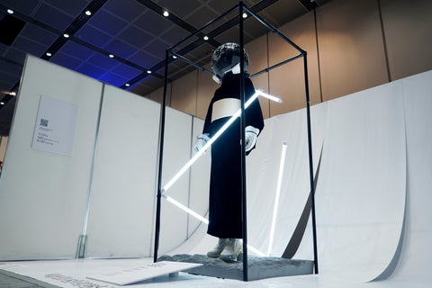この作品は、未来の和服を象徴し、99.9%の光を吸収する漆黒の着物が、まるで未来の着物の姿を映し出しているかのような違和感を与えます。