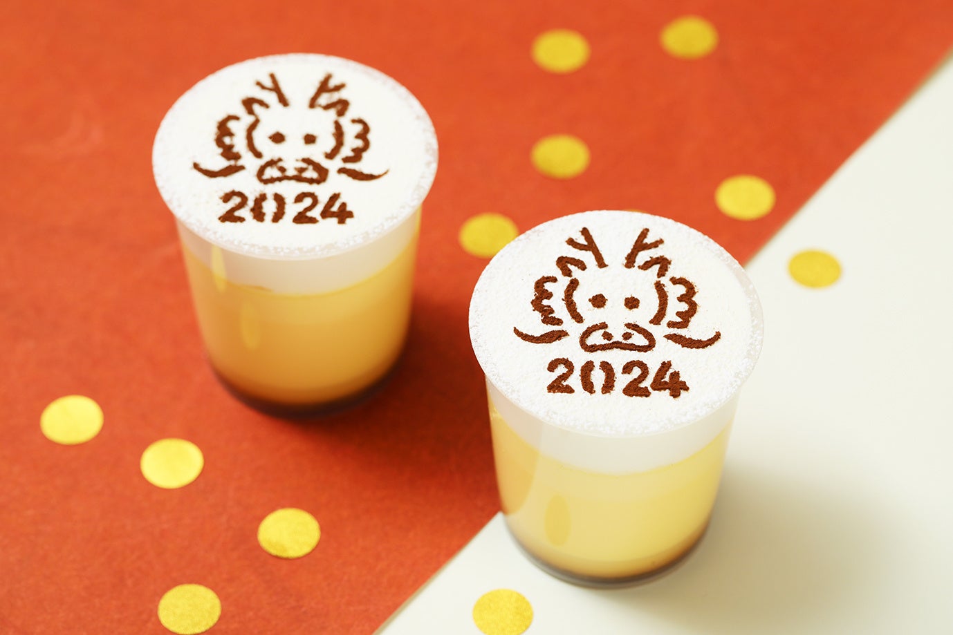 『NEW YEARプリン』は、『なめらかプリン』の上にホイップクリームを重ね、2024年の干支“辰”のイラストをココアパウダーで描いた特別な一品です。