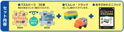 さらに、オリジナルカラーの「でんしゃ」「トラック」消しゴムが付属しており、車輪が回るので、つくった線路や道路の上を走らせて遊ぶこともできます。