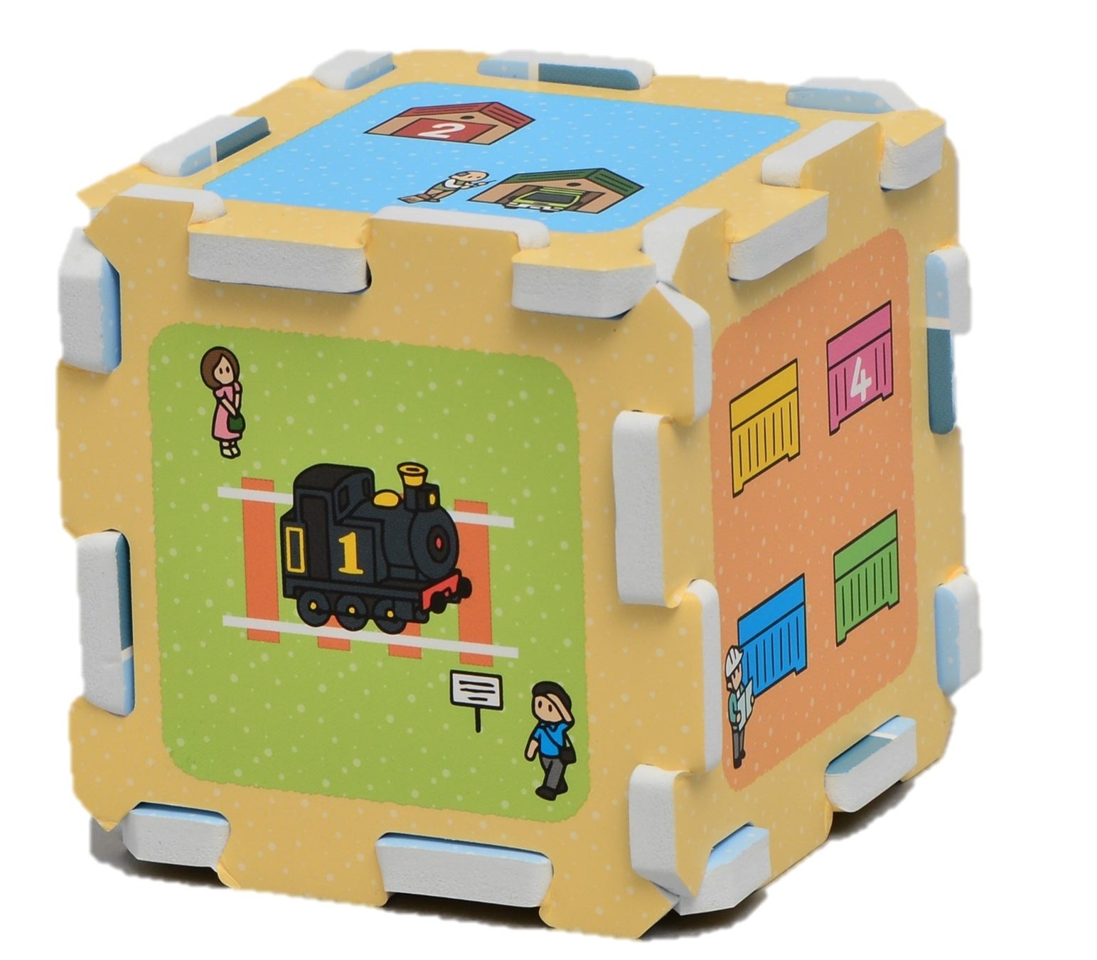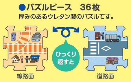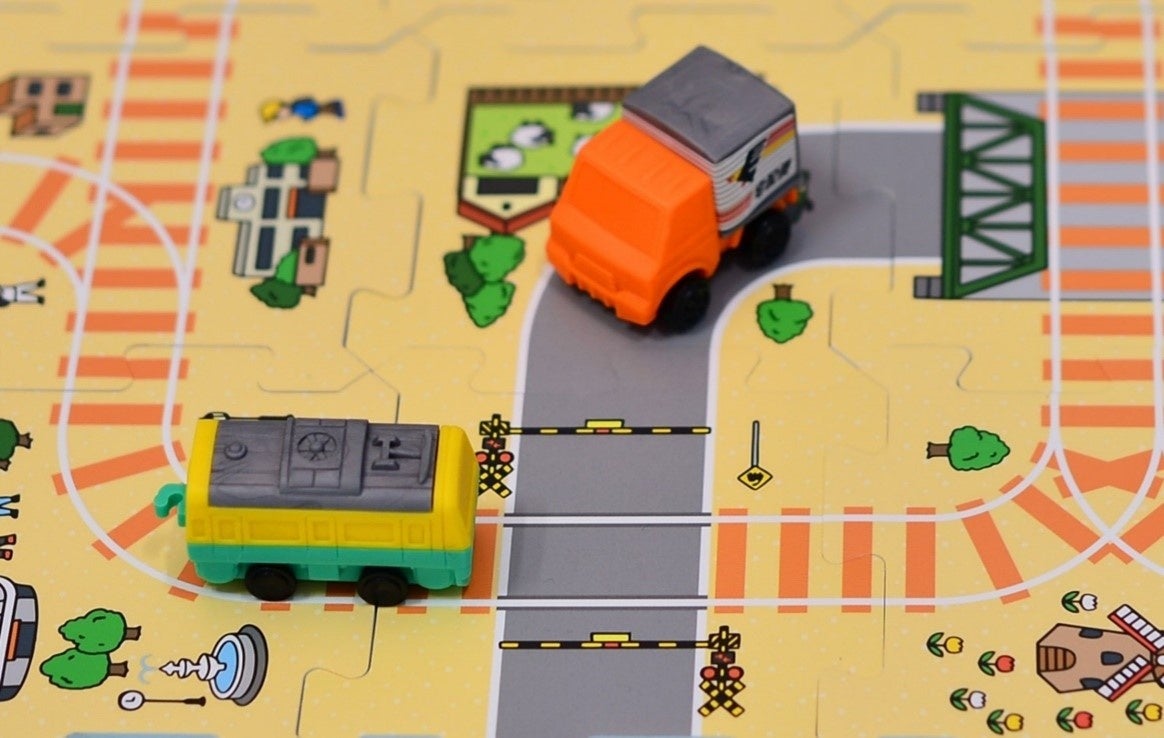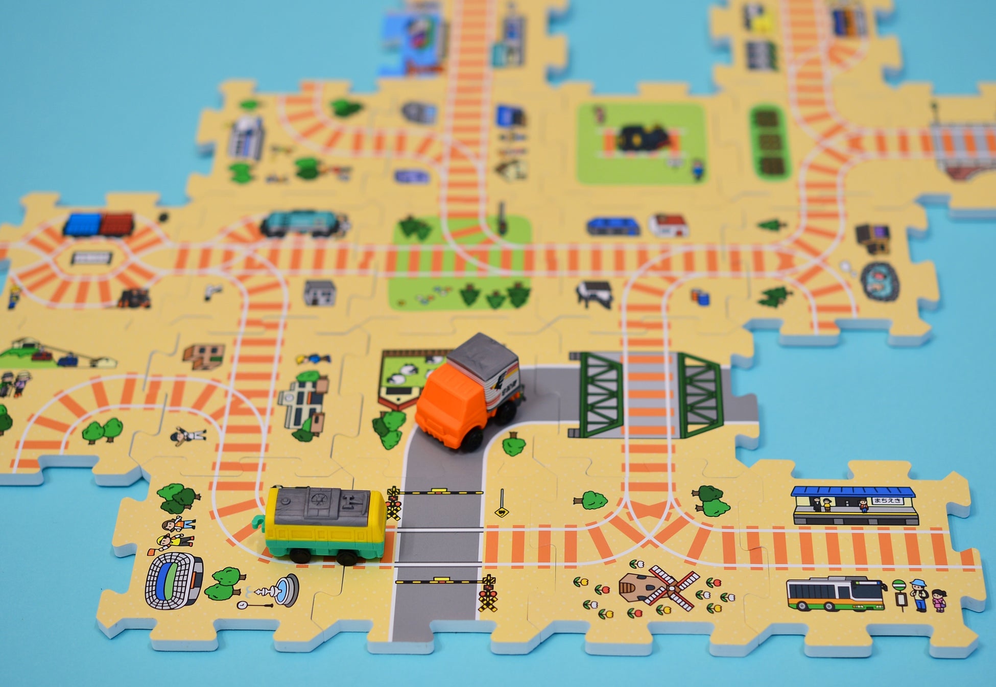 このパズルは、柔らかくて軽い36枚のパズルピースで構成されており、片面が線路面、もう片面が道路面になっています。