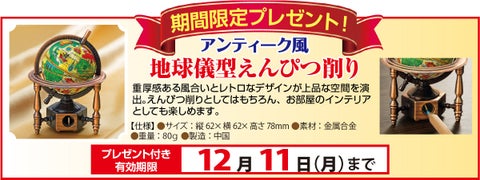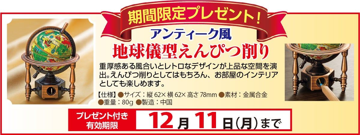 - 12月11日までのキャンペーン期間中に購入すると、地球儀型のえんぴつ削りがプレゼントされる