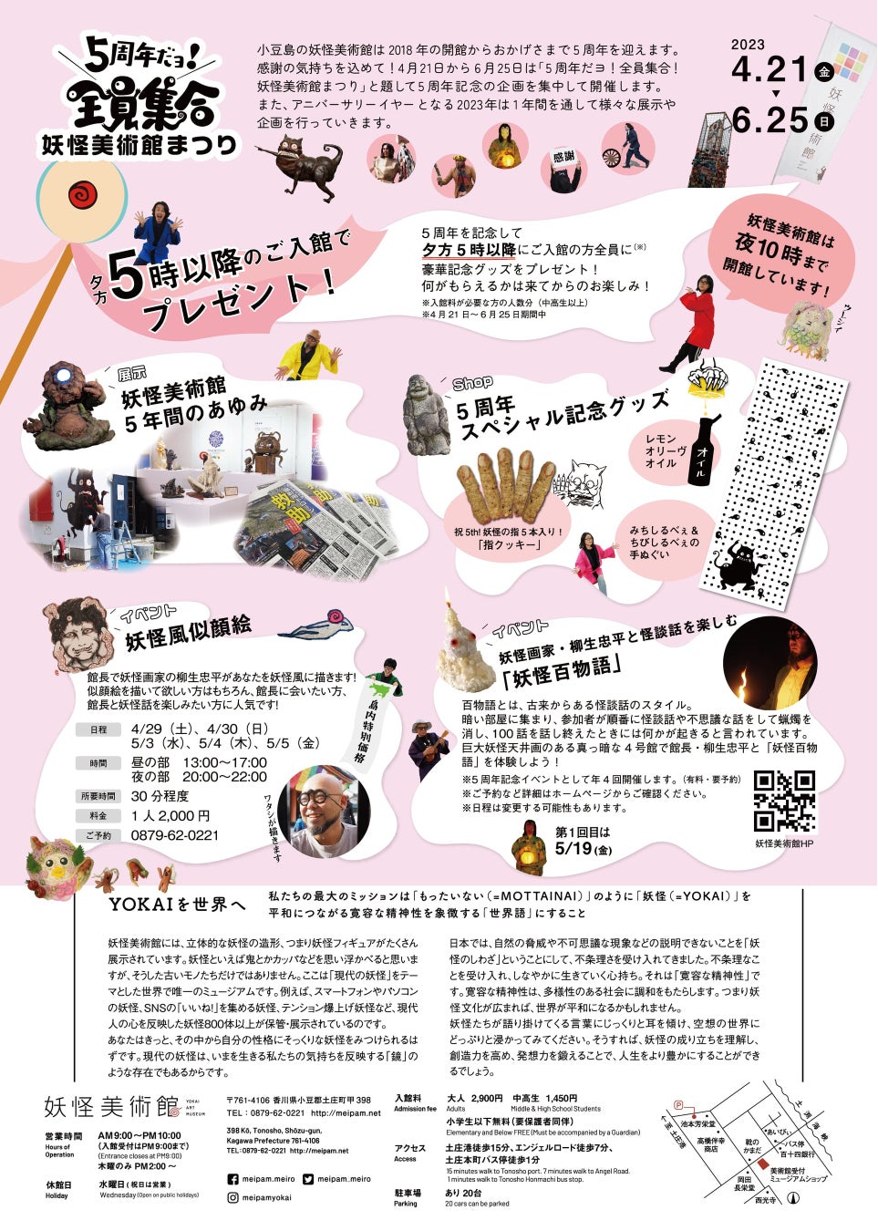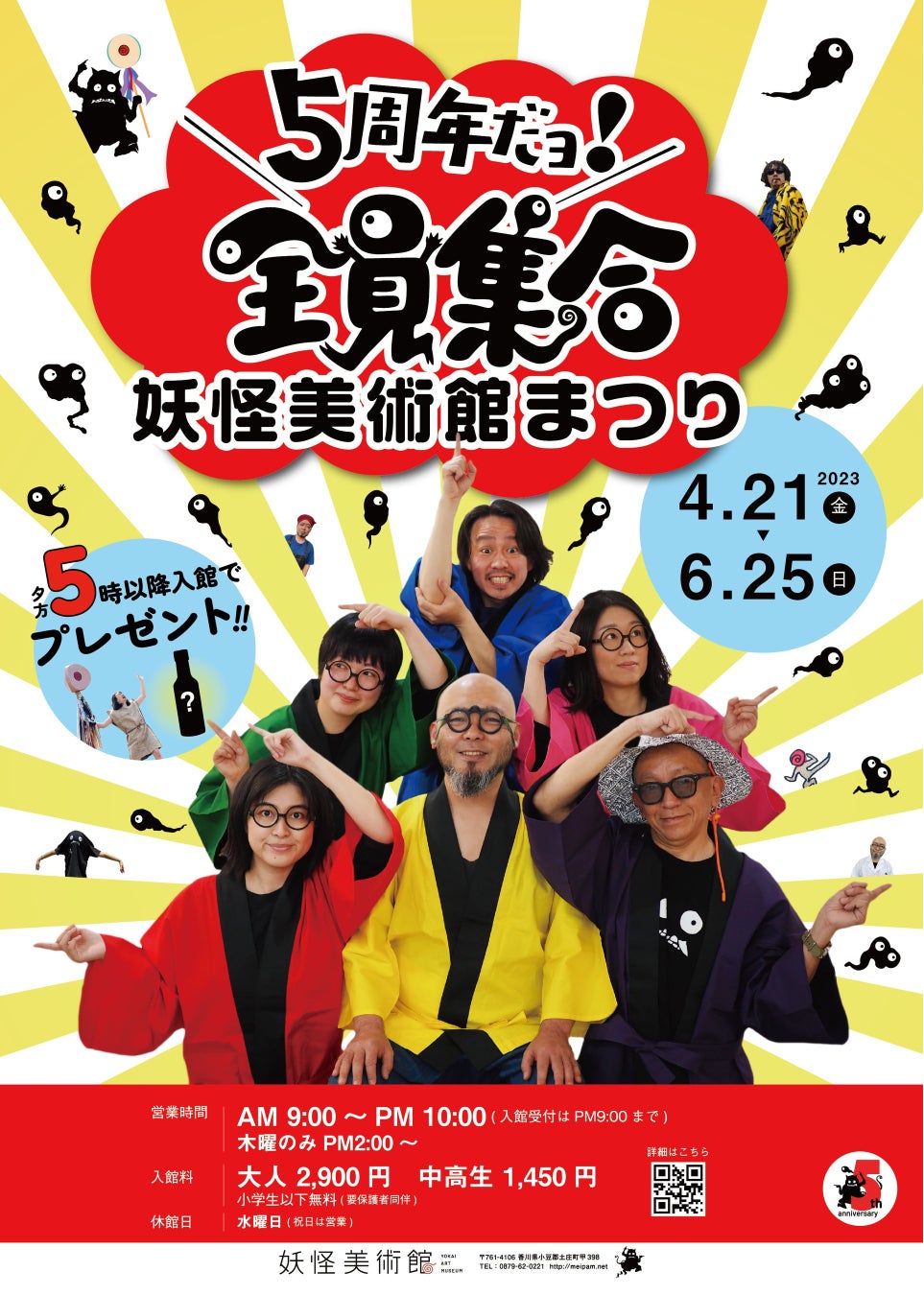 2018年の開館以来、コロナ禍による長期休館などもあり、5年間はコロナに阻まれた5年でもありました。2023年は、リアルな場でお会いできる機会を設けたいと考え「5周年だョ!全員集合!」の掛け声に、全国から小豆島の妖怪美術館に集まっていただけることを願い本企画を開催します。また、本企画を皮切りに2023年は5周年関連イベントを多数ご用意しています。