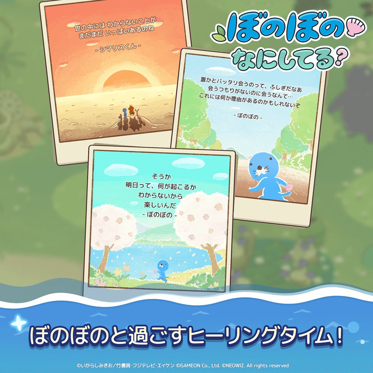 - 「ぼのぼの なにしてる?」は、日本のアニメ「ぼのぼの」の世界を活用した放置型癒しシミュレーションゲーム