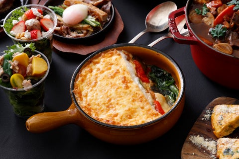 - ファーストディッシュ、スープ、サラダコーナー、ラぺのサラダ、ポークリエットのサラダ、オードブル、人参のフラン、フルーツトマトのカプレーゼ、ケークサレ、温製料理、スパニッシュオムレツ、牛肉の赤ワイン煮込み、豚バラ肉のレンズ豆煮込み、鉄板コーナー、パリパリチキン、すき焼き、デザートコーナー、スイーツ
