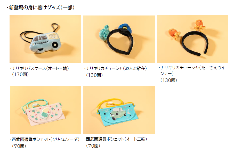 「ナリキリキャンペーン」の開催中に限り、西武園ゆうえんちの物販店舗にてナリキリグッズを購入すると、もれなく夕日の丘商店街のファッションリーダーの証をプレゼント。夕日の丘商店街のファッションリーダーに任命されたゲストは、通常時よりもインタラクションに巻き込まれる機会が増えるほか、当日のコーディネートの写真を「#西武園ゆうえんち」を付けてSNSに投稿することで、西武園ゆうえんち公式アカウントからのリツイートされるチャンスも。これにあわせ、定番のカチューシャや新商品のポシェットなど西武園ゆうえんちオリジナルの身に着けグッズも続々と登場し、30種類以上にバリエーションが拡大します。