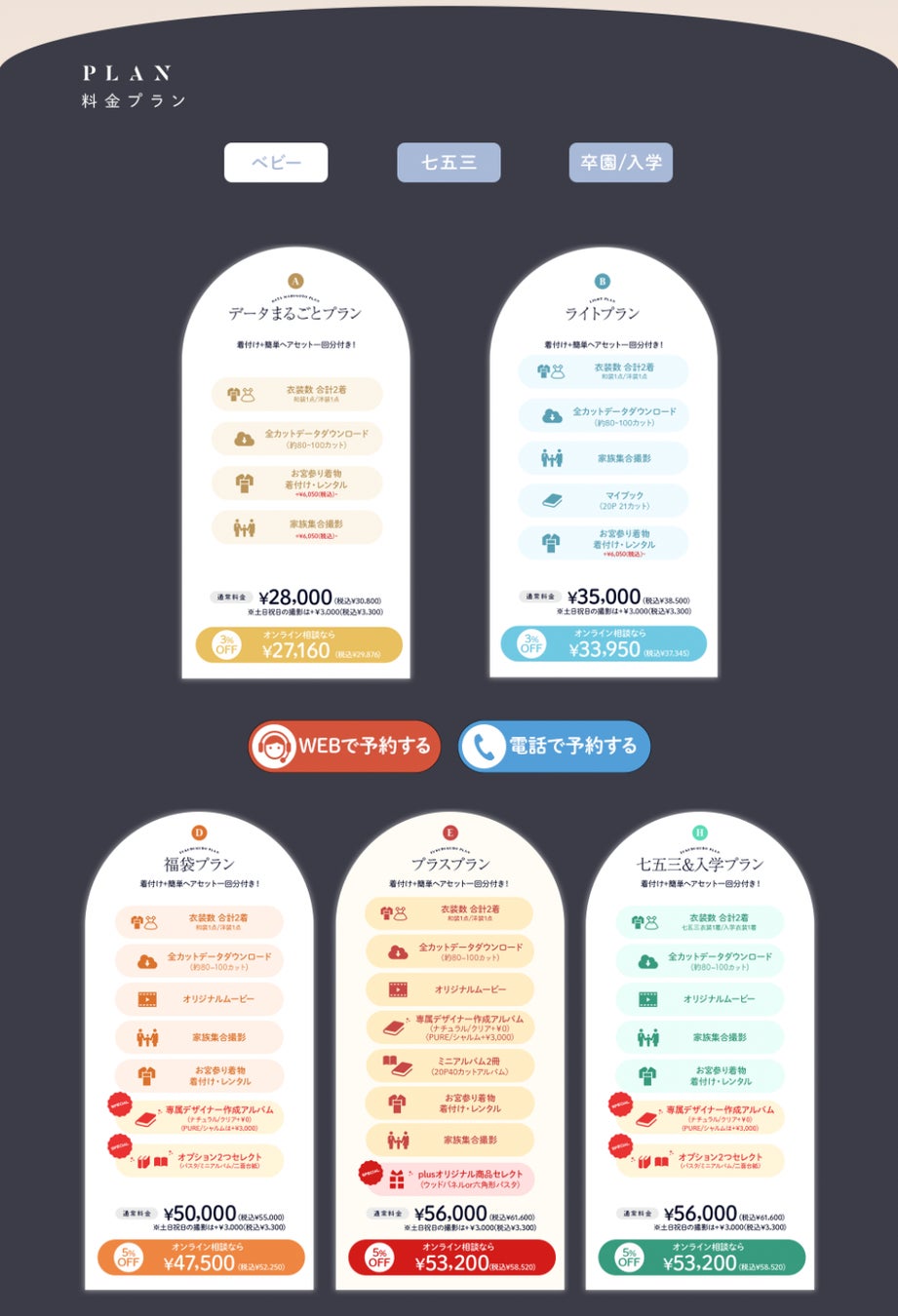 さまざまなプランも用意されており、データのみのプランからアルバムがつくプランまで選ぶことができます。