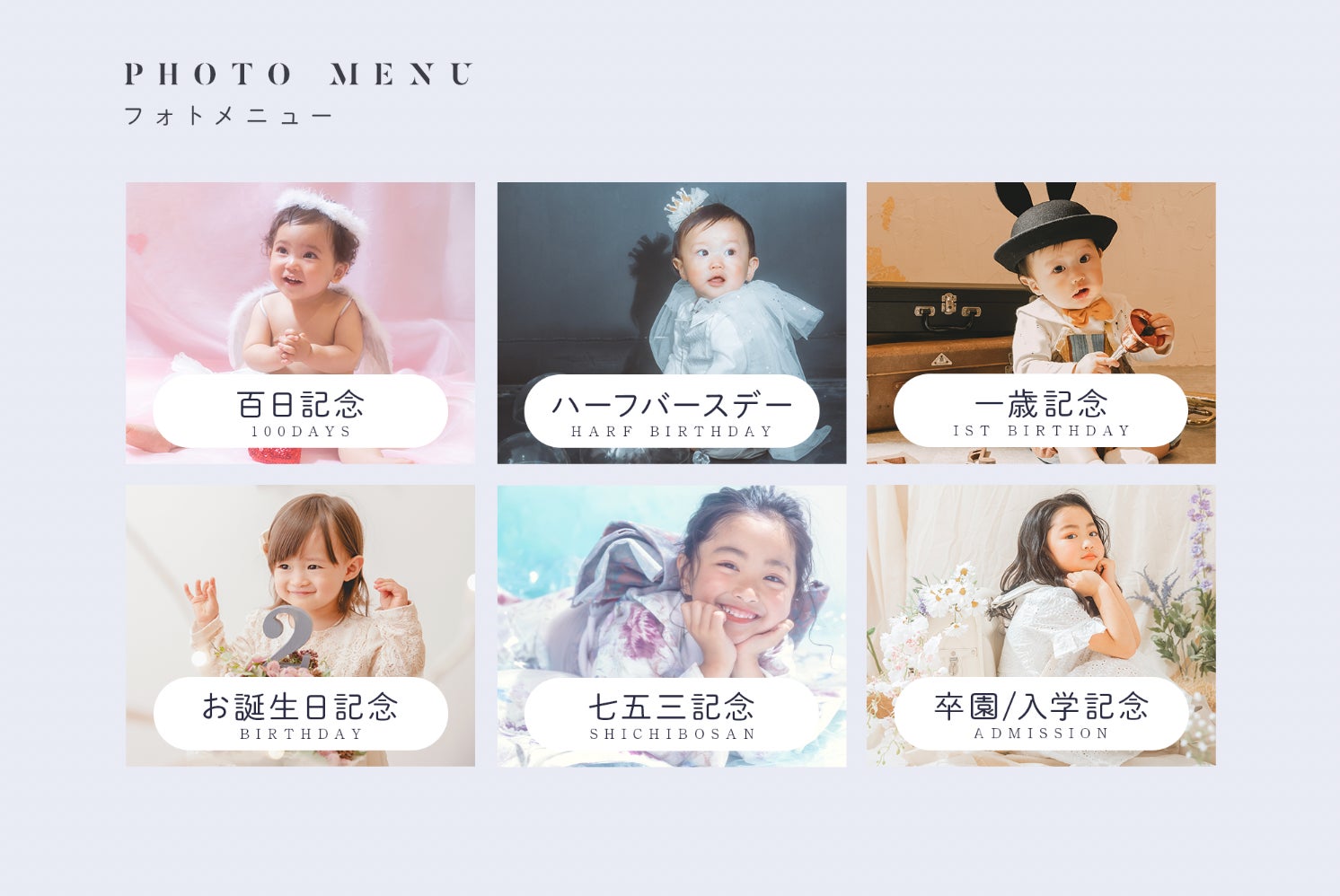 ベビーからキッズまでの撮影受付種目があり、百日記念撮影から七五三・入学&卒園記念まで、お子様の成長を記念に撮影を提供しています。