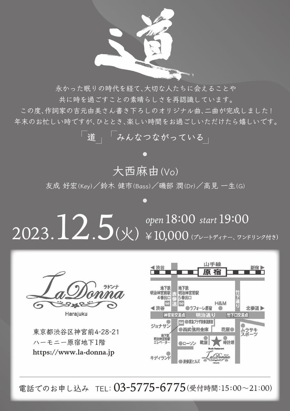 2023年12月5日(火)には、大西麻由2023コンサート「道」が原宿のラドンナで開催されます。