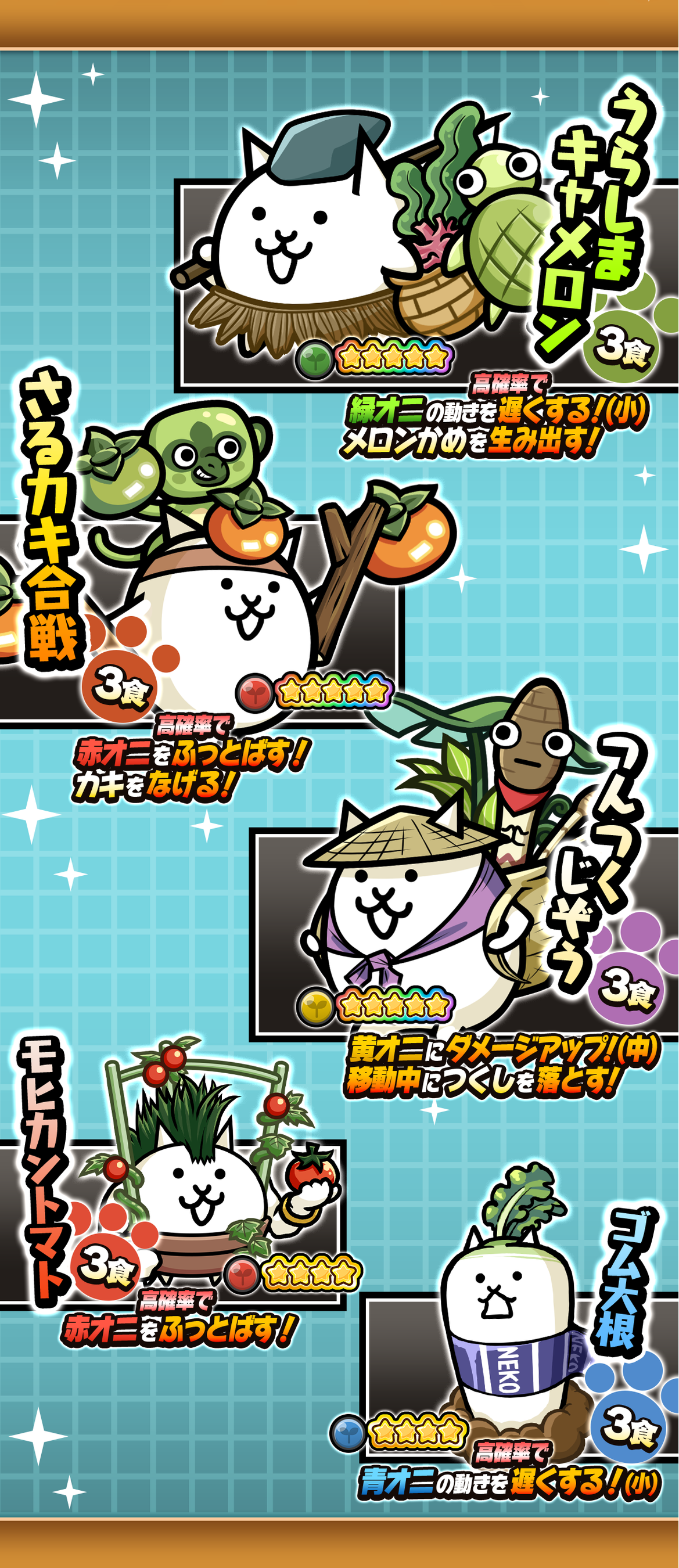 - 桃太郎失格、にゃんこ大戦争、コラボイベント限定の「ベジ丸」、コラボ専用イベントステージ、オニソウル、コラボイベント限定のベジ丸「ネコのお買い物」、コラボガチャ、限定キャラクター、命の水超セール!、別冊コロコロコミック