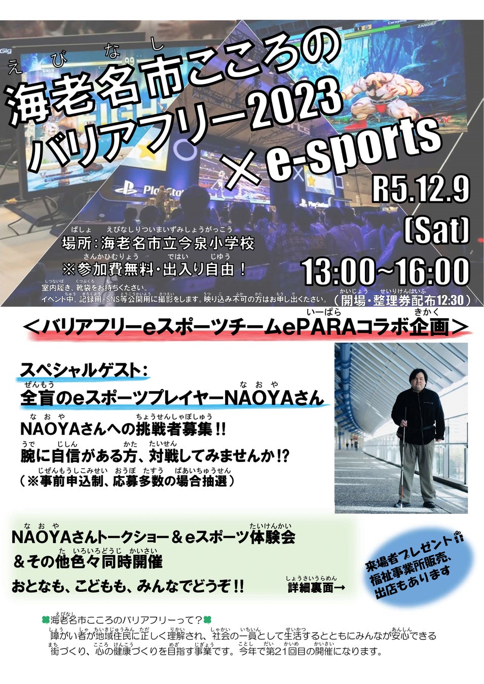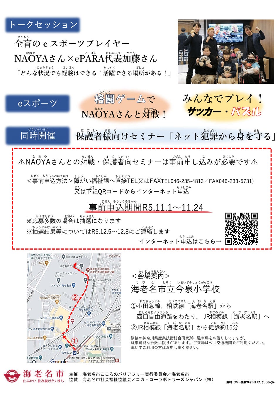 イベントでは、全盲のeスポーツプレイヤーNAOYAとのトークセッションや、インターネットの安全な利用方法についてのミニセミナー、障がい当事者とのeスポーツ体験会などが行われます。