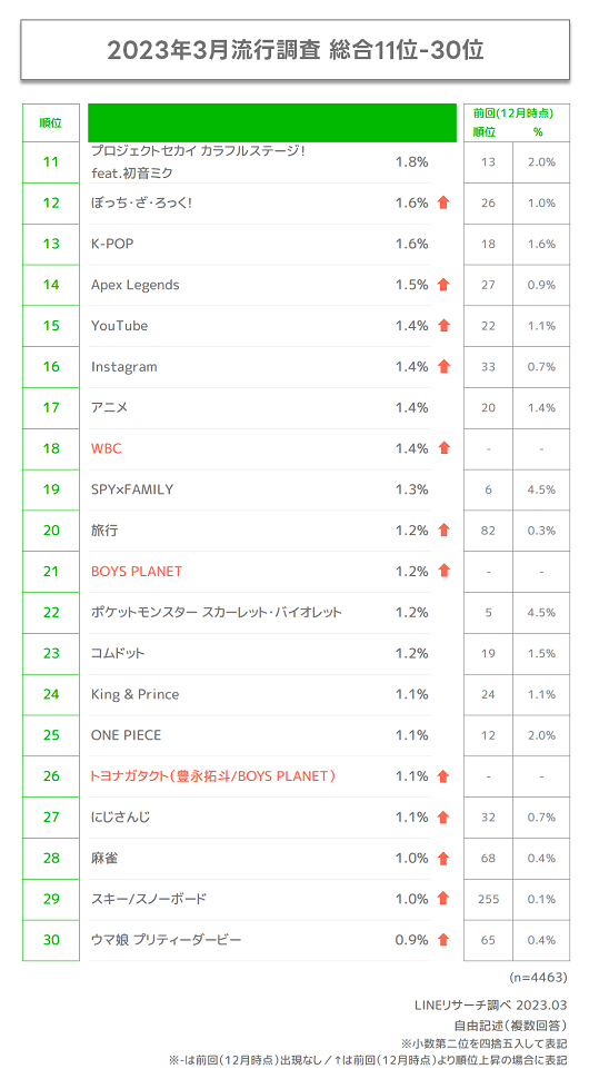 18位には、調査実施時期がWBC開催前ではありましたが「WBC」がランクインしました。21位には、グローバルボーイズオーディション番組「BOYS PLANET」が急上昇ランクインしました。また、26位には、BOYS PLANETの練習生の「トヨナガタクト」がランクインしました。