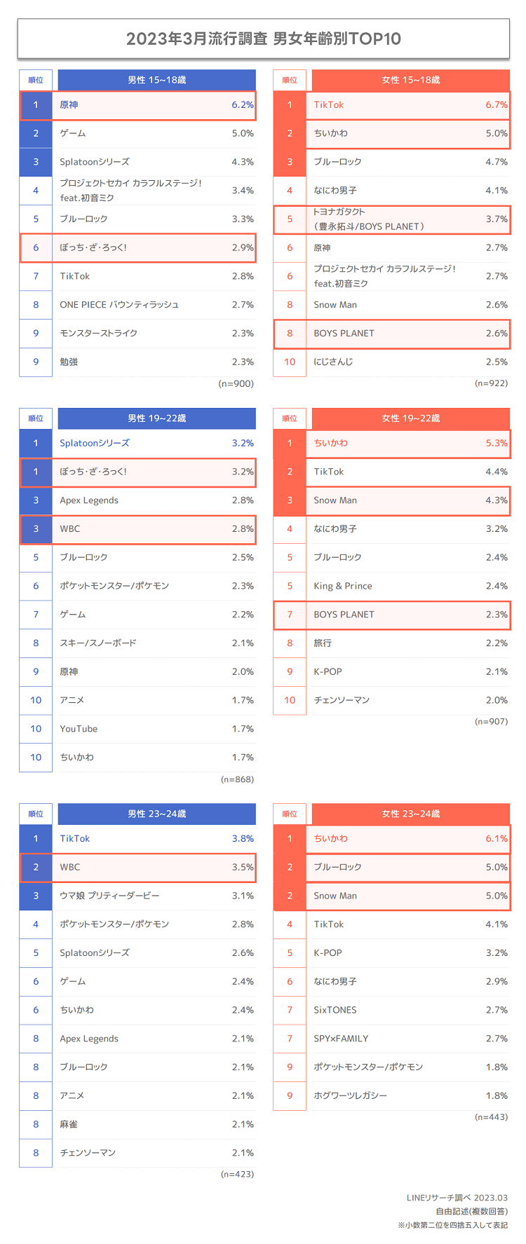 男性の傾向をみると、各年齢層で上位に違いがみられるもののゲームやマンガ、アニメのタイトルが並びました。 男性15~18歳では、「原神」が1位となりました。男性19~22歳では、「ぼっち・ざ・ろっく!」が1位で、男性15~18歳でも6位にランクインしました。また、男性19~22歳と男性23~24歳では「WBC」が3位以内にランクインしました。