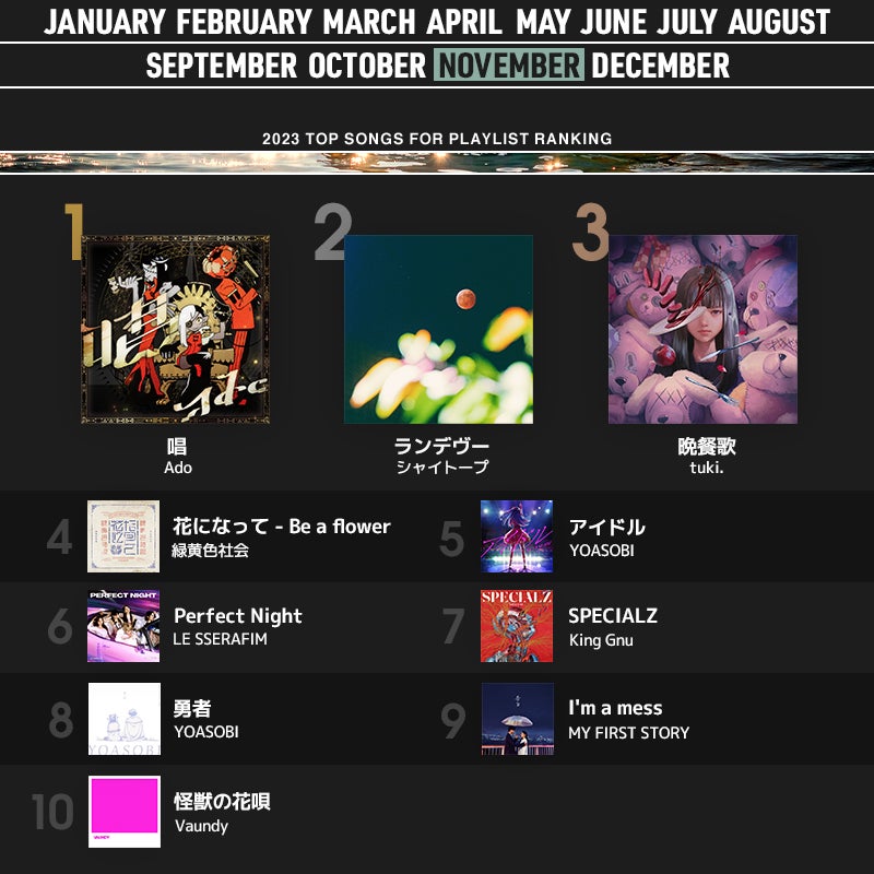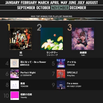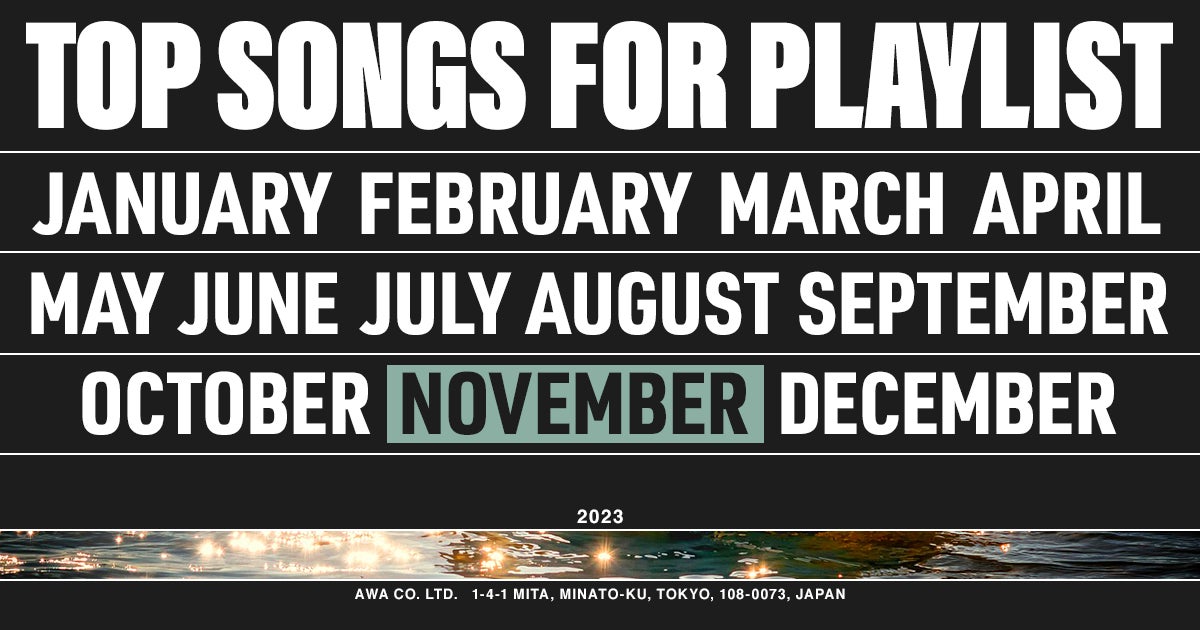 AWA株式会社が運営する音楽ストリーミングサービス「AWA」は、ユーザーが作成したプレイリストへの採用楽曲を集計し、11月のランキングを発表しました。