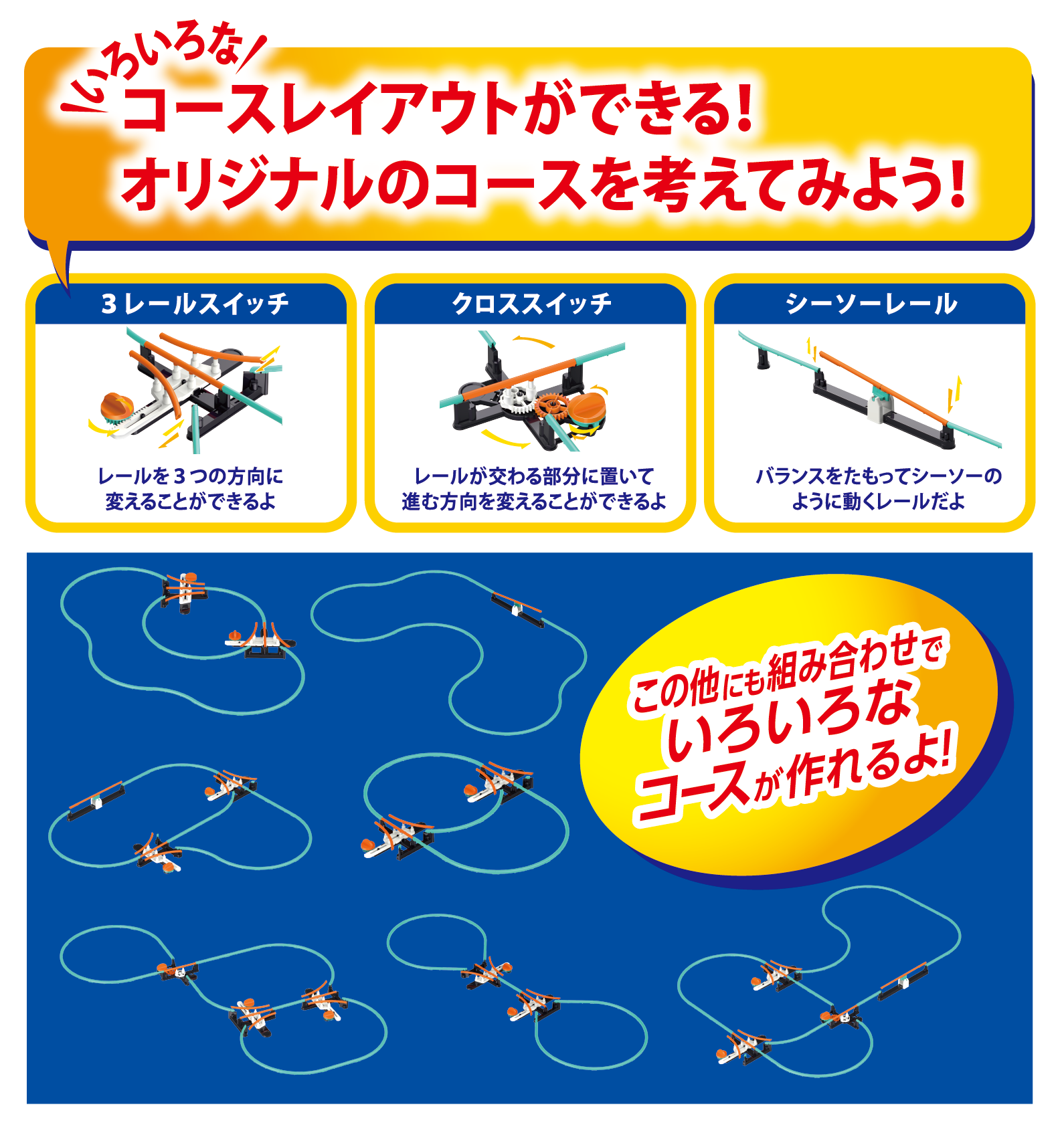 進むコースには、3レールスイッチやシーソーレールがあり、多彩なレイアウトに組み替え可能。