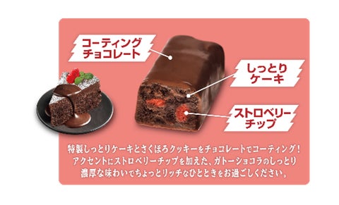 • ビターなチョコレートでコーティングされ、ストロベリーチップがアクセントに