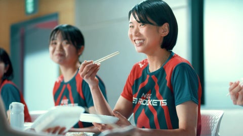 このCMでは、佐々木選手、古賀選手、松島選手がそれぞれの場所で練習後にお弁当を楽しそうに食べるシーンが描かれています。