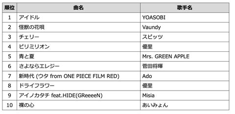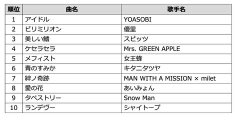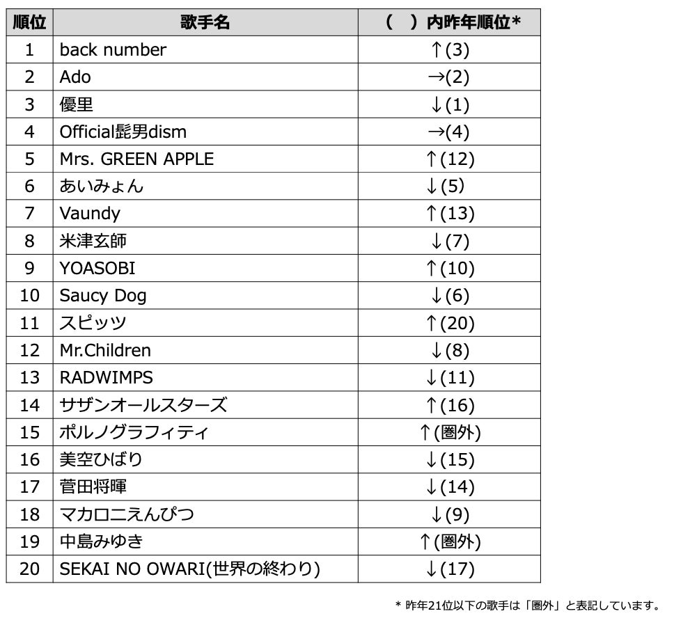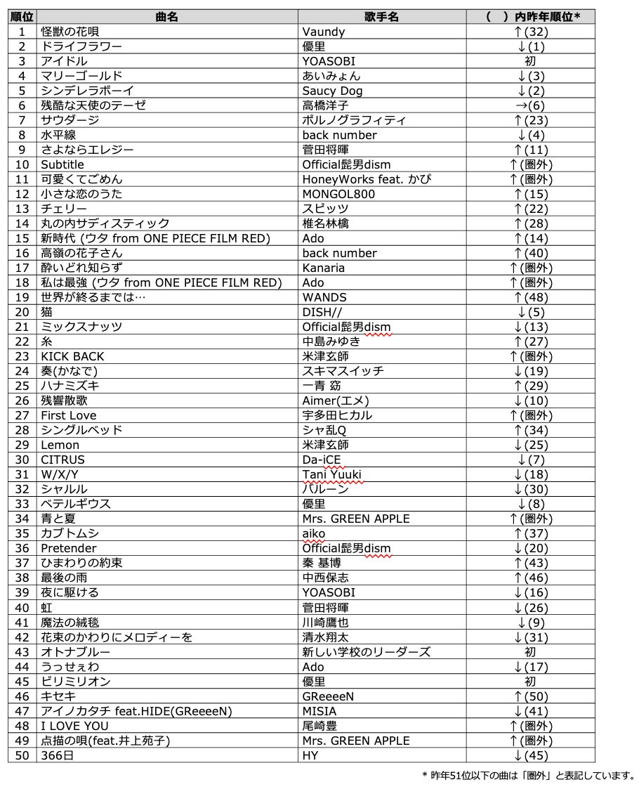 Vaundyの「怪獣の花唄」が【楽曲別】で1位に輝き、back numberが【歌手別】でトップになりました。