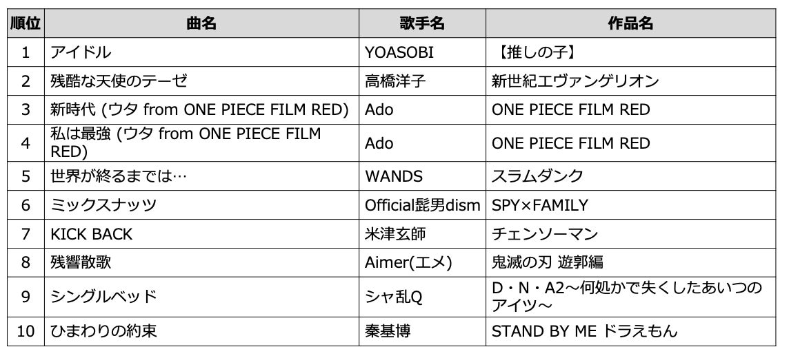 - Vaundyの「怪獣の花唄」が楽曲別で1位