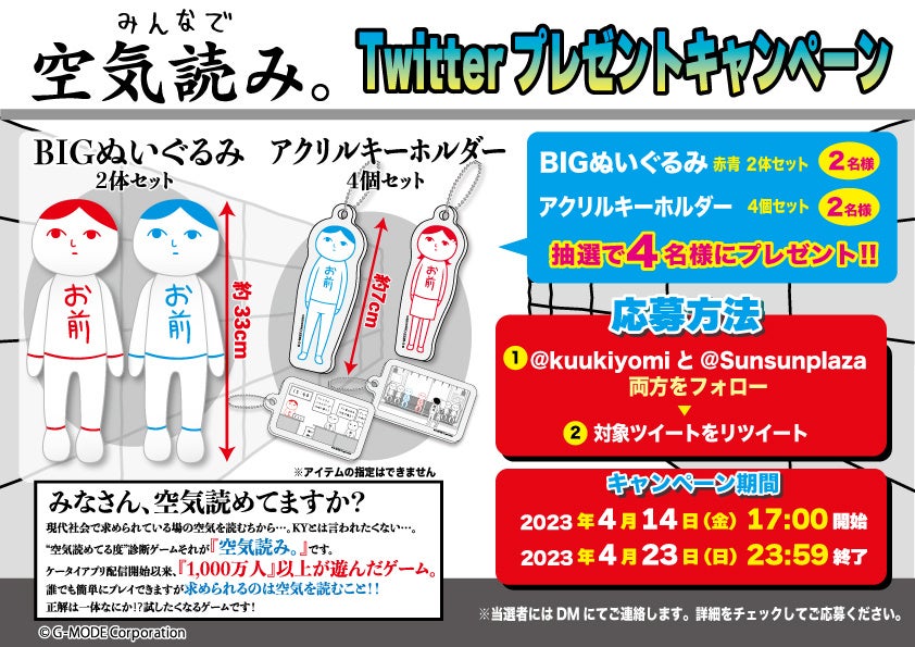 株式会社ジー・モード(本社:東京都品川区、代表取締役社長:加藤征一郎 https://gmodecorp.com/)は、1,000万人が遊んだKY(空気読めてる)度診断ゲーム「みんなで空気読み。」のオリジナルグッズ(ぬいぐるみ、キーホルダー)が、株式会社サンプラザより4月下旬頃より全国のゲームセンターなどでプライズ商品として登場することをお知らせします。