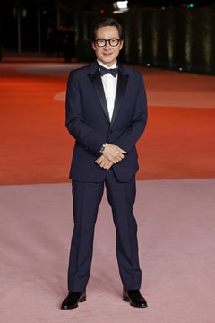 キー・ホイ・クァンも同様に、ネイビーのウールとシルクのピークドラペルタキシードにホワイトコットンのウィングチップカラーシャツを合わせ、ネイビーシルクのボウタイとブラックレザーブーツをコーディネートしました。