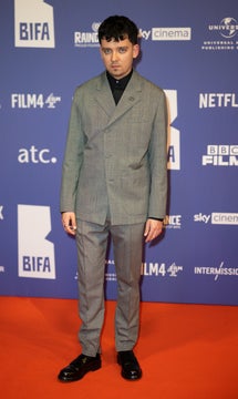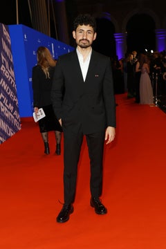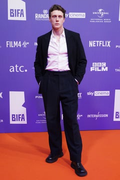 エイサ・バターフィールドは、グレーウールのワークウェア ジャケットとパンツにブラックコットンシャツを合わせ、ブラックのレザーローファーを履いて登場しました。